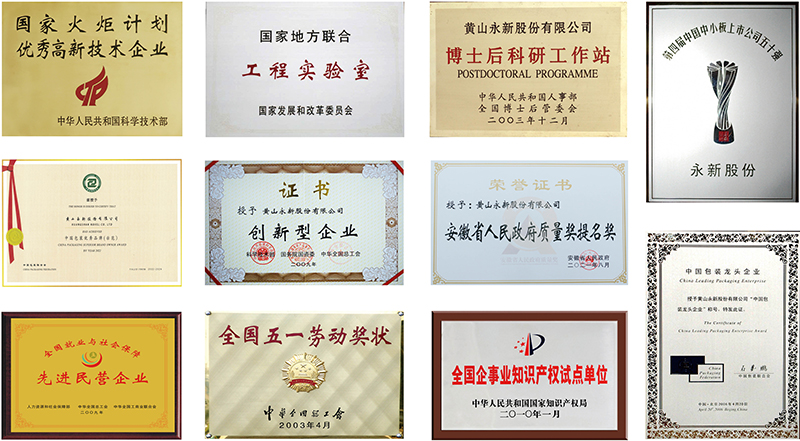 全國(guó)五一勞動(dòng)獎(jiǎng)狀;國(guó)家創(chuàng)新型企業(yè);中國(guó)創(chuàng)新型企業(yè)100強(qiáng);中國(guó)包裝龍頭企業(yè);中國(guó)包裝優(yōu)秀示范品牌;國(guó)家首批資源節(jié)約型環(huán)境友好型試點(diǎn)企業(yè);全國(guó)就業(yè)與社會(huì)保障先進(jìn)民營(yíng)企業(yè);國(guó)家火炬計(jì)劃重點(diǎn)高新技術(shù)企業(yè);中國(guó)中小企業(yè)板上市公司50強(qiáng);全國(guó)守合同重信用企業(yè);全國(guó)先進(jìn)包裝企業(yè);全國(guó)企事業(yè)單位知識(shí)產(chǎn)權(quán)試點(diǎn)單位;全國(guó)輕工業(yè)先進(jìn)卓越績(jī)效企業(yè);海關(guān)AA級(jí)企業(yè);中國(guó)醫(yī)藥包裝優(yōu)秀單位;安徽省人民政府質(zhì)量獎(jiǎng)提名獎(jiǎng)